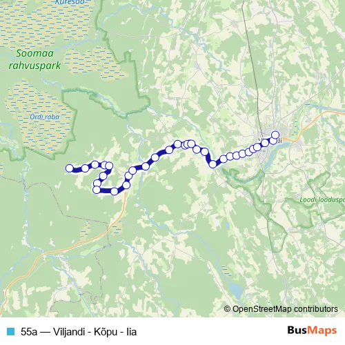 The first stop of the 55a bus route is Iia and the last stop is Viljandi bussijaam. 55a (Viljandi - Kõpu - Iia) is operational during tööpäeviti.