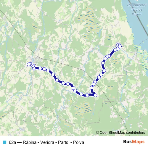 The first stop of the 62a bus route is Räpina bussijaam and the last stop is Põlva bussijaam. 62a (Räpina - Veriora - Partsi - Põlva) is operational during iga päev.