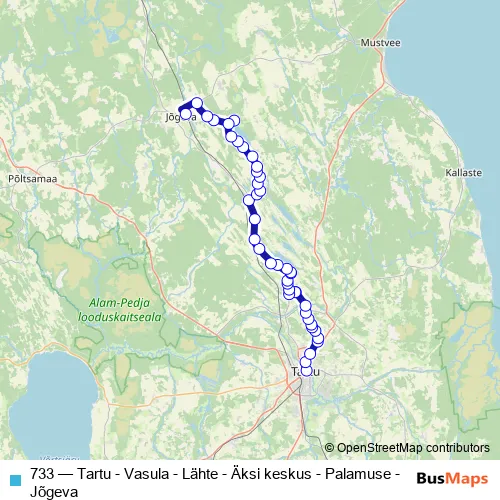 The first stop of the 733 bus route is Tartu bussijaam and the last stop is Jõgeva. 733 (Tartu - Vasula - Lähte - Äksi keskus - Palamuse - Jõgeva) is operational during iga päev.
