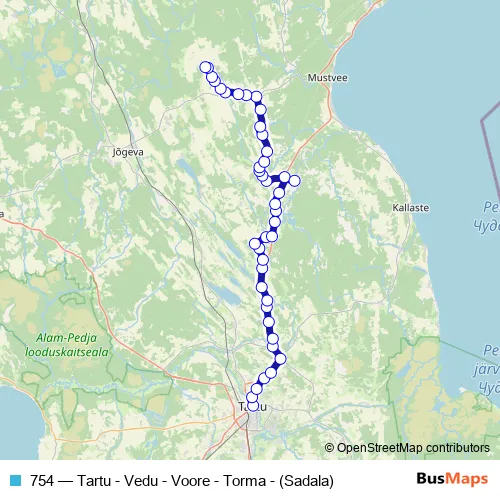 The first stop of the 754 bus route is Tartu bussijaam and the last stop is Sadala. 754 (Tartu - Vedu - Voore - Torma - (Sadala)) is operational during tööpäeviti.