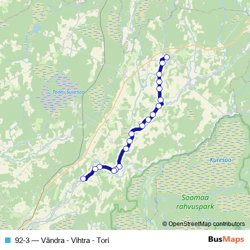 The first stop of the 92-3 bus route is Vändra and the last stop is Tori. 92-3 (Vändra - Vihtra - Tori) is operational during tööpäeviti.