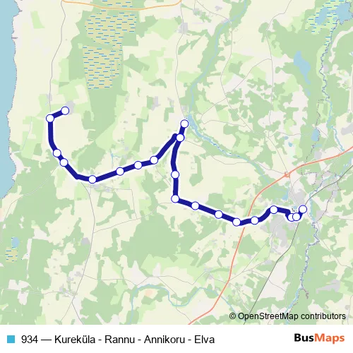 The first stop of the 934 bus route is Kureküla and the last stop is Elva. 934 (Kureküla - Rannu - Annikoru - Elva) is operational during iga päev.