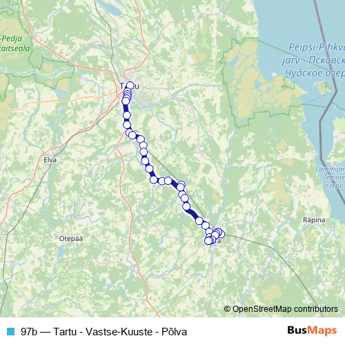 The first stop of the 97b bus route is Tartu bussijaam and the last stop is Põlva bussijaam. 97b (Tartu - Vastse-Kuuste - Põlva) is operational during tööpäeviti.