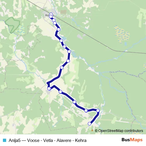 The first stop of the Anija5 bus route is Kehra raudteejaam and the last stop is Alavere. Anija5 (Voose - Vetla - Alavere - Kehra) is operational during iga päev.