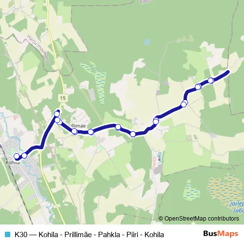 The first stop of the K30 bus route is Kohila and the last stop is Kohila. K30 (Kohila - Prillimäe - Pahkla - Piiri - Kohila) is operational during tööpäeviti.