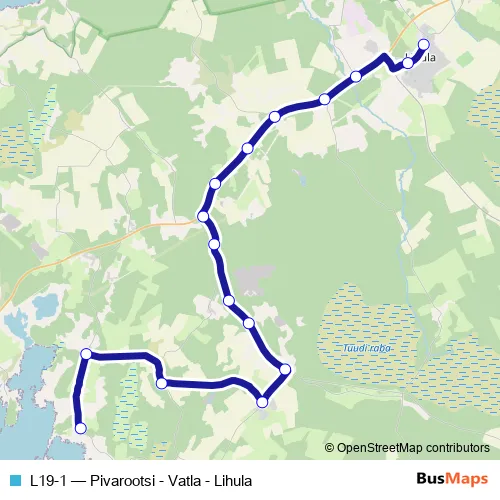 The first stop of the L19-1 bus route is Lihula and the last stop is Pivarootsi. L19-1 (Pivarootsi - Vatla - Lihula) is operational during tööpäeviti.