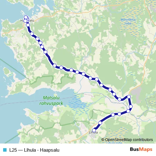 The first stop of the L25 bus route is Lihula and the last stop is Haapsalu bussijaam. L25 (Lihula - Haapsalu) is operational during iga päev.