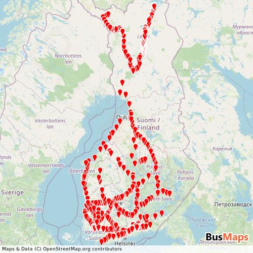 Onnibus operates in the following cities: Helsinki, Rauma, Turku, Perna, Tampere, Salo, Vaasa, Askola, Iisalmi, Jyvaeskylae, Levi, Forssa, Halikko, Kokkola, Kuopio, Kylmaekoski, Lovisa, Mouhijaervi, Muonio, Oulu, Paimio, Pielavesi, Porvoo, Savonlinna, Sodankylae.