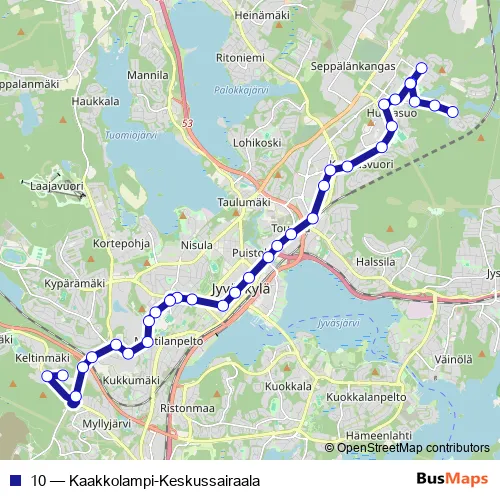 See why over 2 million users trust and consider busmaps.com as the best public transport website. busmaps gives you Jyvaeskylae Buses suggested routes, real-time bus tracker, line route maps in Jyvaeskylae, and helps to find the closest 10 bus stops near you. No internet available? Download an offline PDF map and bus schedule for the 10 bus to take on your trip.