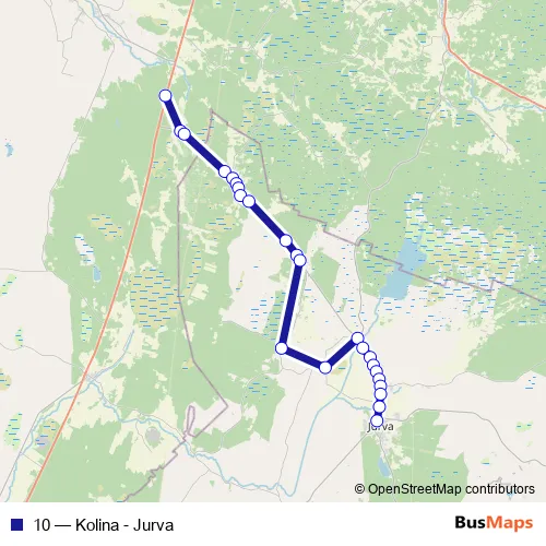 The first stop of the 10 bus route is Kolina 8-tie E and the last stop is Jurva. 10 (Kolina - Jurva) is operational during arkipäivisin.
