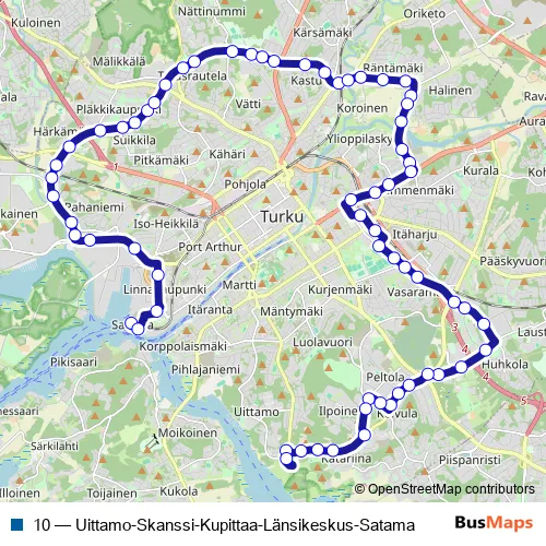 The first stop of the 10 bus route is Turun satama (Silja) and the last stop is Uittamo pääte. 10 (Uittamo-Skanssi-Kupittaa-Länsikeskus-Satama) is operational during joka päivä.