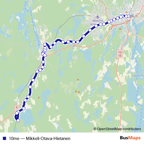 The first stop of the 10me bus route is Mikkeli laituri 5 and the last stop is Hietasen asema P. 10me (Mikkeli-Otava-Hietanen) is operational during arkipäivisin.