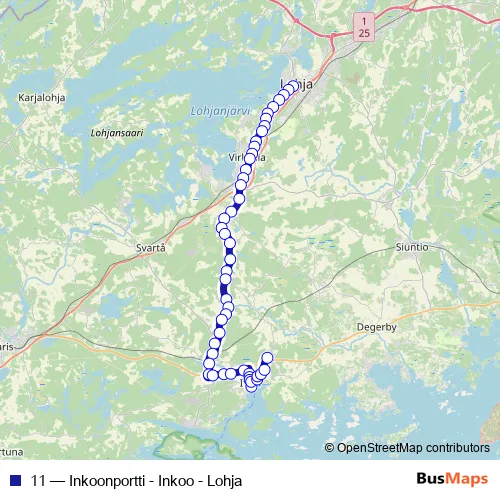 The first stop of the 11 bus route is 6 and the last stop is Inkoonportti. 11 (Inkoonportti - Inkoo - Lohja) is operational during arkipäivisin.