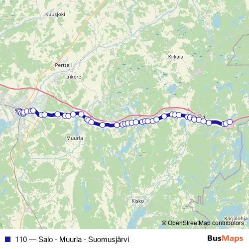 The first stop of the 110 bus route is Salo linja-autoasema and the last stop is Lahnajärvi. 110 (Salo - Muurla - Suomusjärvi) is operational during arkipäivisin.