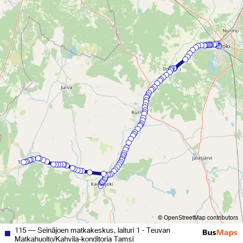 The first stop of the 115 bus route is Seinäjoen matkakeskus, laituri 1 and the last stop is