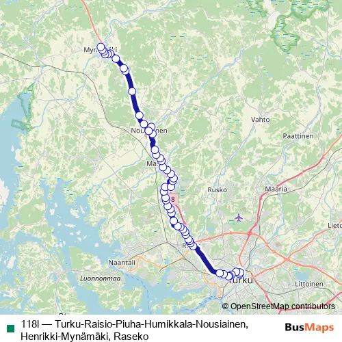 Bus 118l - Turku-Raisio-Piuha-Humikkala-Nousiainen, Henrikki-Mynämäki, Raseko Schedule in Turku