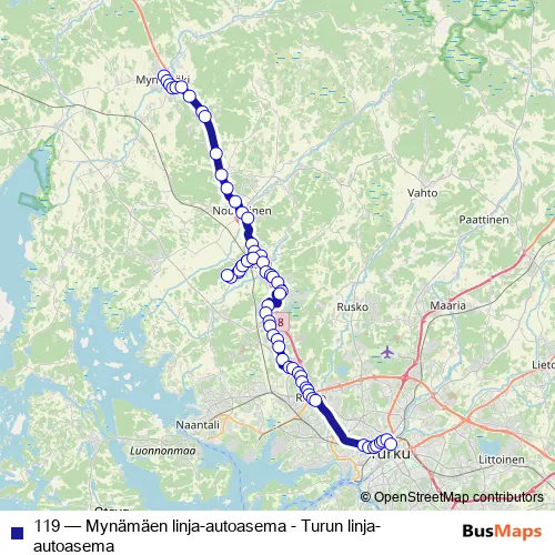 The first stop of the 119 bus route is Mynämäen linja-autoasema and the last stop is