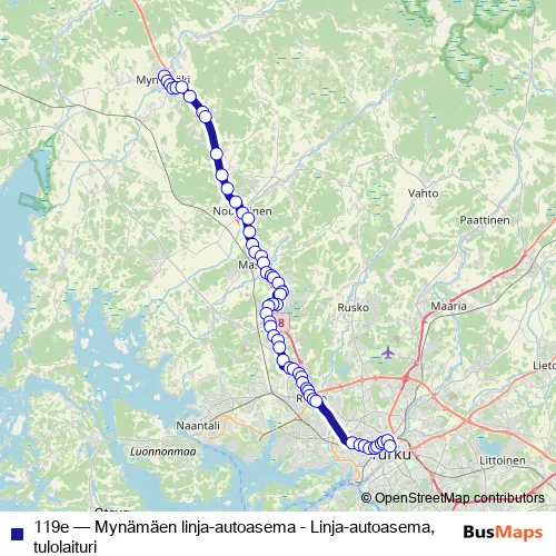 Linja-autoasema, tulolaituri. 119e (Mynämäen linja-autoasema - Linja-autoasema, tulolaituri) is operational during joka päivä.