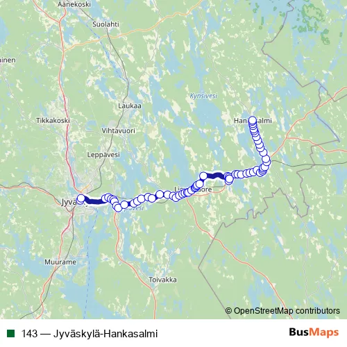 The first stop of the 143 bus route is Jyväskylä Matkakeskus 4 and the last stop is Hankasalmi kk (MH) Riukulantie 3. 143 (Jyväskylä-Hankasalmi) is operational during joka päivä.