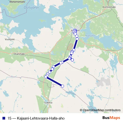 The first stop of the 15 bus route is Lähtölaituri 6 and the last stop is Hanhelantie Halla-Aho E. 15 (Kajaani-Lehtovaara-Halla-aho) is operational during arkipäivisin.
