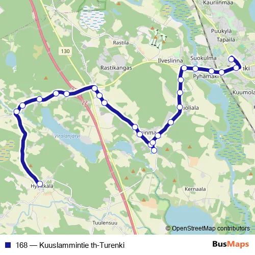 The first stop of the 168 bus route is Kuuslammintie P and the last stop is Turenki linja-autoasema. 168 (Kuuslammintie th-Turenki) is operational during arkipäivisin.