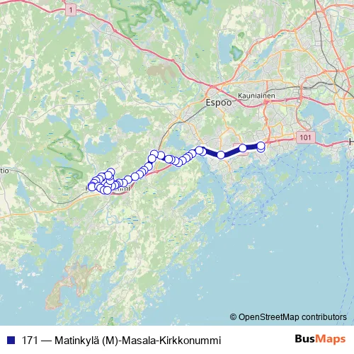 The first stop of the 171 bus route is Matinkylä (M) and the last stop is Kirkkonummi mk. 171 (Matinkylä (M)-Masala-Kirkkonummi) is operational during joka päivä.