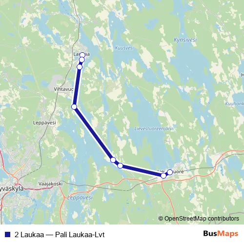 See why over 2 million users trust and consider busmaps.com as the best public transport website. busmaps gives you Jyvaeskylae Buses suggested routes, real-time bus tracker, line route maps in Jyvaeskylae, and helps to find the closest 2 Laukaa bus stops near you. No internet available? Download an offline PDF map and bus schedule for the 2 Laukaa bus to take on your trip.
