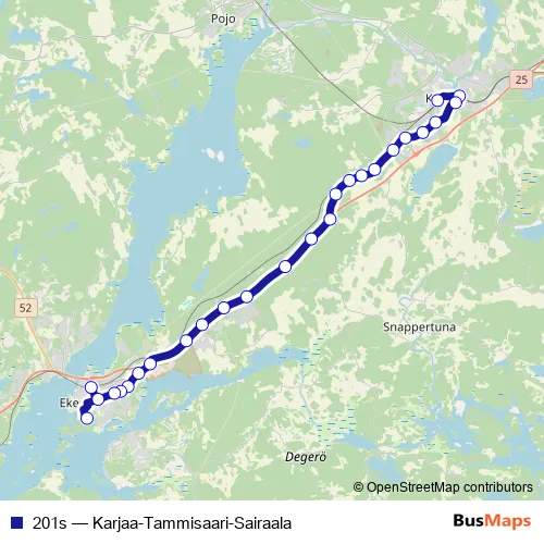 The first stop of the 201s bus route is Karjaa Matkakeskus 2 and the last stop is Tammisaaren linja-autoasema. 201s (Karjaa-Tammisaari-Sairaala) is operational during arkipäivisin.