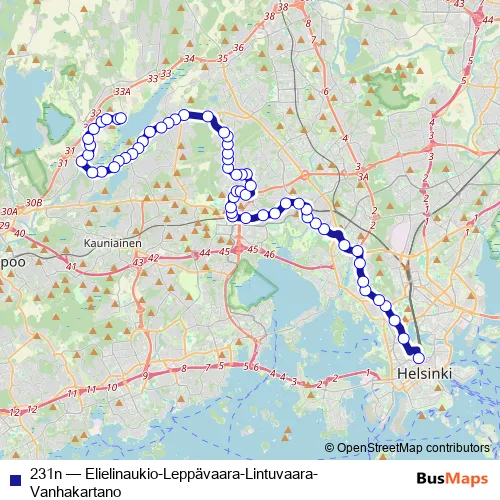 See why over 2 million users trust and consider busmaps.com as the best public transport website. busmaps gives you Helsinki Buses suggested routes, real-time bus tracker, line route maps in Helsinki, and helps to find the closest 231n bus stops near you. No internet available? Download an offline PDF map and bus schedule for the 231n bus to take on your trip.