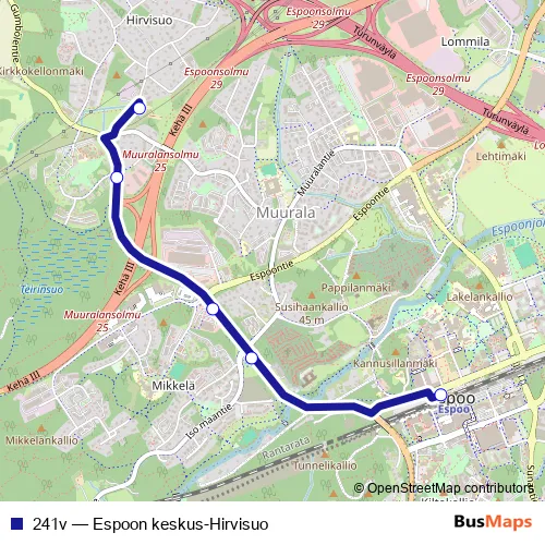 The first stop of the 241v bus route is Vanha Muuralantie and the last stop is Espoon asema. 241v (Espoon keskus-Hirvisuo) is operational during arkipäivisin.