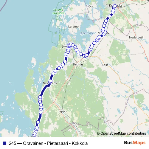 The first stop of the 245 bus route is ABC Oravainen and the last stop is linja-autoasema. 245 (Oravainen - Pietarsaari - Kokkola) is operational during arkipäivisin.