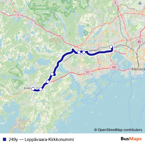 See why over 2 million users trust and consider busmaps.com as the best public transport website. busmaps gives you Kirkkonummi Buses suggested routes, real-time bus tracker, line route maps in Kirkkonummi, and helps to find the closest 249y bus stops near you. No internet available? Download an offline PDF map and bus schedule for the 249y bus to take on your trip.