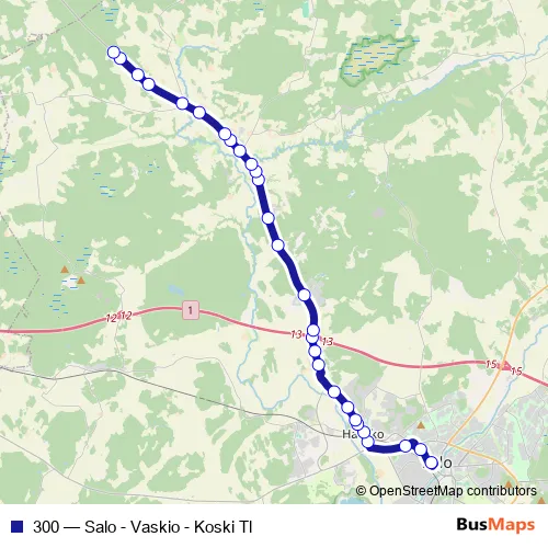 The first stop of the 300 bus route is Salo linja-autoasema and the last stop is Nummila P. 300 (Salo - Vaskio - Koski Tl) is operational during arkipäivisin.
