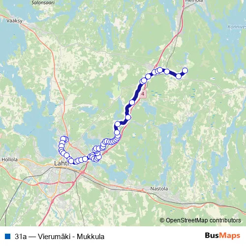 The first stop of the 31a bus route is Kaivolankatu (kääntöpaikka) and the last stop is Vierumäen urheiluopisto P. 31a (Vierumäki - Mukkula) is operational during arkipäivisin.