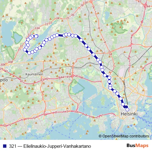 See why over 2 million users trust and consider busmaps.com as the best public transport website. busmaps gives you Helsinki Buses suggested routes, real-time bus tracker, line route maps in Helsinki, and helps to find the closest 321 bus stops near you. No internet available? Download an offline PDF map and bus schedule for the 321 bus to take on your trip.
