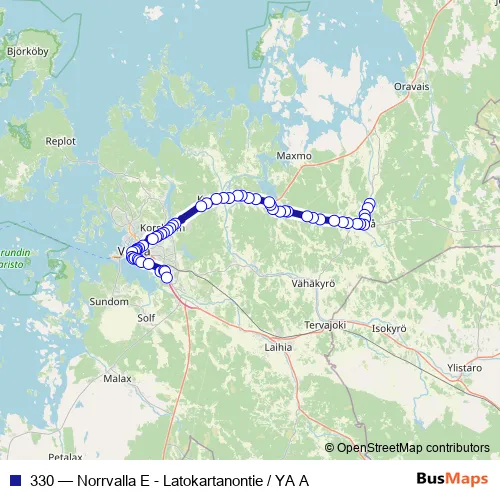 See why over 2 million users trust and consider busmaps.com as the best public transport website. busmaps gives you Vaasa Buses suggested routes, real-time bus tracker, line route maps in Vaasa, and helps to find the closest 330 bus stops near you. No internet available? Download an offline PDF map and bus schedule for the 330 bus to take on your trip.
