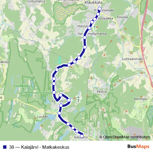 The first stop of the 38 bus route is Ruskatie and the last stop is 6. 38 (Kalajärvi - Matkakeskus) is operational during arkipäivisin.