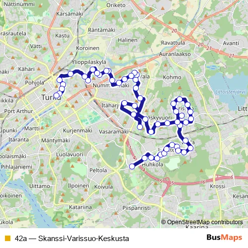 See why over 2 million users trust and consider busmaps.com as the best public transport website. busmaps gives you Turku Buses suggested routes, real-time bus tracker, line route maps in Turku, and helps to find the closest 42a bus stops near you. No internet available? Download an offline PDF map and bus schedule for the 42a bus to take on your trip.