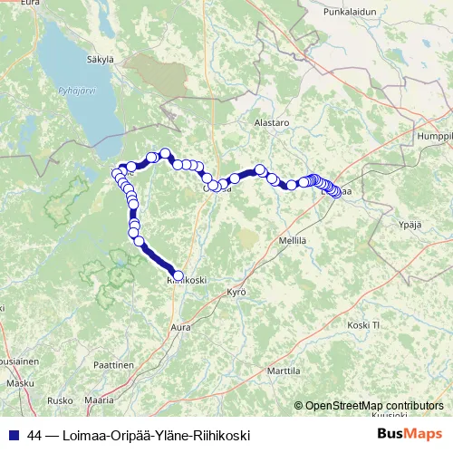 The first stop of the 44 bus route is Loimaan linja-autoasema and the last stop is Riihikoski Neste. 44 (Loimaa-Oripää-Yläne-Riihikoski) is operational during arkipäivisin.