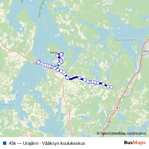 The first stop of the 45k bus route is Kalliorinteentie L and the last stop is Vääksyn koulukeskus E. 45k (Urajärvi - Vääksyn koulukeskus) is operational during arkipäivisin.