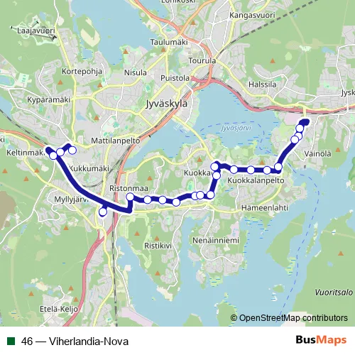 See why over 2 million users trust and consider busmaps.com as the best public transport website. busmaps gives you Jyvaeskylae Buses suggested routes, real-time bus tracker, line route maps in Jyvaeskylae, and helps to find the closest 46 bus stops near you. No internet available? Download an offline PDF map and bus schedule for the 46 bus to take on your trip.
