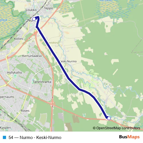 The first stop of the 54 bus route is Toukotie 1 and the last stop is Keski-Nurmon koulu. 54 (Nurmo - Keski-Nurmo) is operational during arkipäivisin.