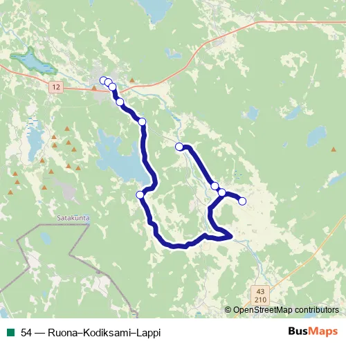 The first stop of the 54 bus route is Lapin koulu I and the last stop is Kaukola P. 54 (Ruona–Kodiksami–Lappi) is operational during arkipäivisin.