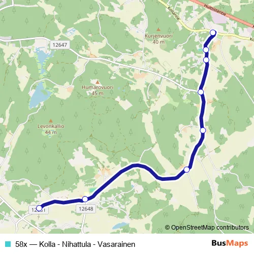 The first stop of the 58x bus route is Kolla I and the last stop is Ihamontie L. 58x (Kolla - Nihattula - Vasarainen) is operational during arkipäivisin.