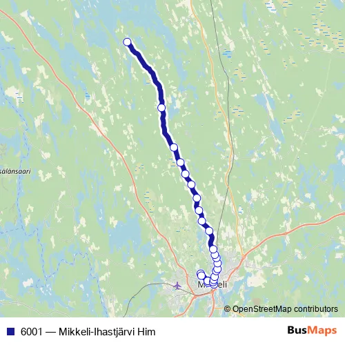 The first stop of the 6001 bus route is Mikkeli laituri 6 and the last stop is Pulliala L. 6001 (Mikkeli-Ihastjärvi Him) is operational during arkipäivisin.