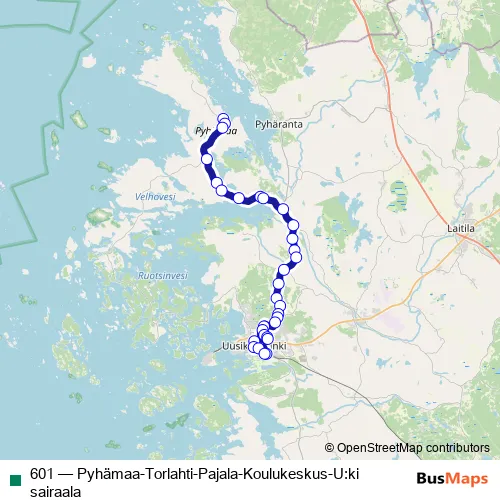 The first stop of the 601 bus route is Pyhämään koulu L and the last stop is Terveystie E. 601 (Pyhämaa-Torlahti-Pajala-Koulukeskus-U:ki sairaala) is operational during arkipäivisin.