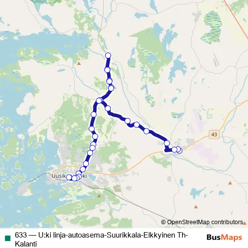 See why over 2 million users trust and consider busmaps.com as the best public transport website. busmaps gives you Uusikaupunki Buses suggested routes, real-time bus tracker, line route maps in Uusikaupunki, and helps to find the closest 633 bus stops near you. No internet available? Download an offline PDF map and bus schedule for the 633 bus to take on your trip.
