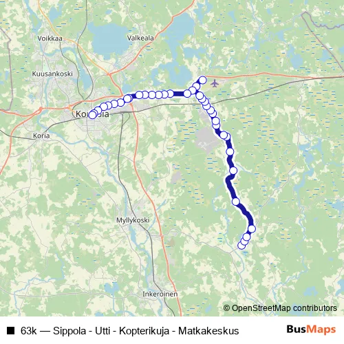 The first stop of the 63k bus route is Sippola I and the last stop is Kouvola Matkakeskus linja-autoasema. 63k (Sippola - Utti - Kopterikuja - Matkakeskus) is operational during arkipäivisin.
