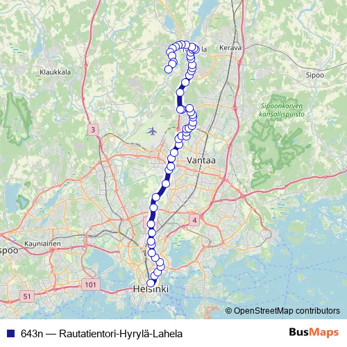 See why over 2 million users trust and consider busmaps.com as the best public transport website. busmaps gives you Helsinki Buses suggested routes, real-time bus tracker, line route maps in Helsinki, and helps to find the closest 643n bus stops near you. No internet available? Download an offline PDF map and bus schedule for the 643n bus to take on your trip.