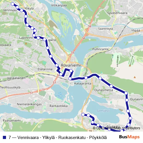See why over 2 million users trust and consider busmaps.com as the best public transport website. busmaps gives you Rovaniemi Buses suggested routes, real-time bus tracker, line route maps in Rovaniemi, and helps to find the closest 7 bus stops near you. No internet available? Download an offline PDF map and bus schedule for the 7 bus to take on your trip.